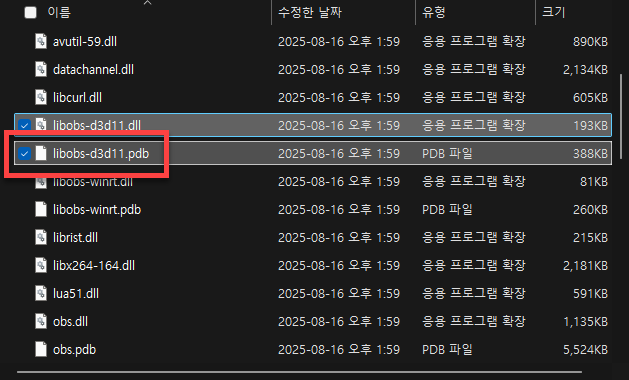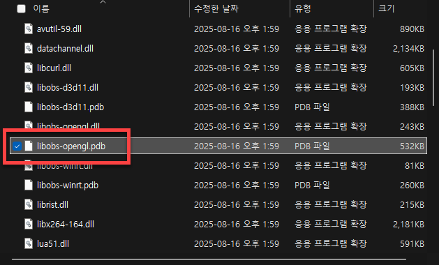 폴더 내에서 libobs-opengl.pdb 파일을 찾아 삭제합니다.