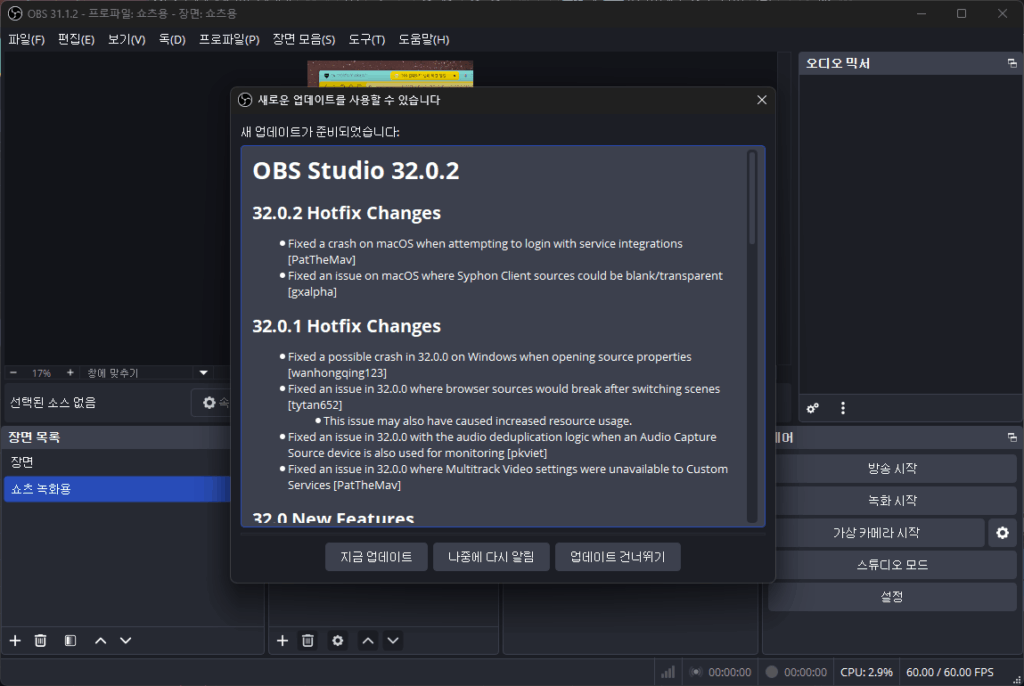 중요한 방송 직전에는 업데이트를 하지 마세요. 예상치 못한 오류가 발생할 수 있습니다.